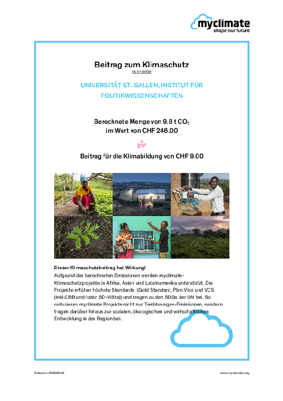 Wenn Flugreisen unvermeidbar sind, gleicht der Lehrstuhl die negativen Auswirkungen auf die Umwelt durch Spenden an myclimate aus, eine in der Schweiz zertifizierte Organisation, die sich für die Neutralisierung von CO2-Emissionen durch Investitionen in Klimaschutzprojekte einsetzt.